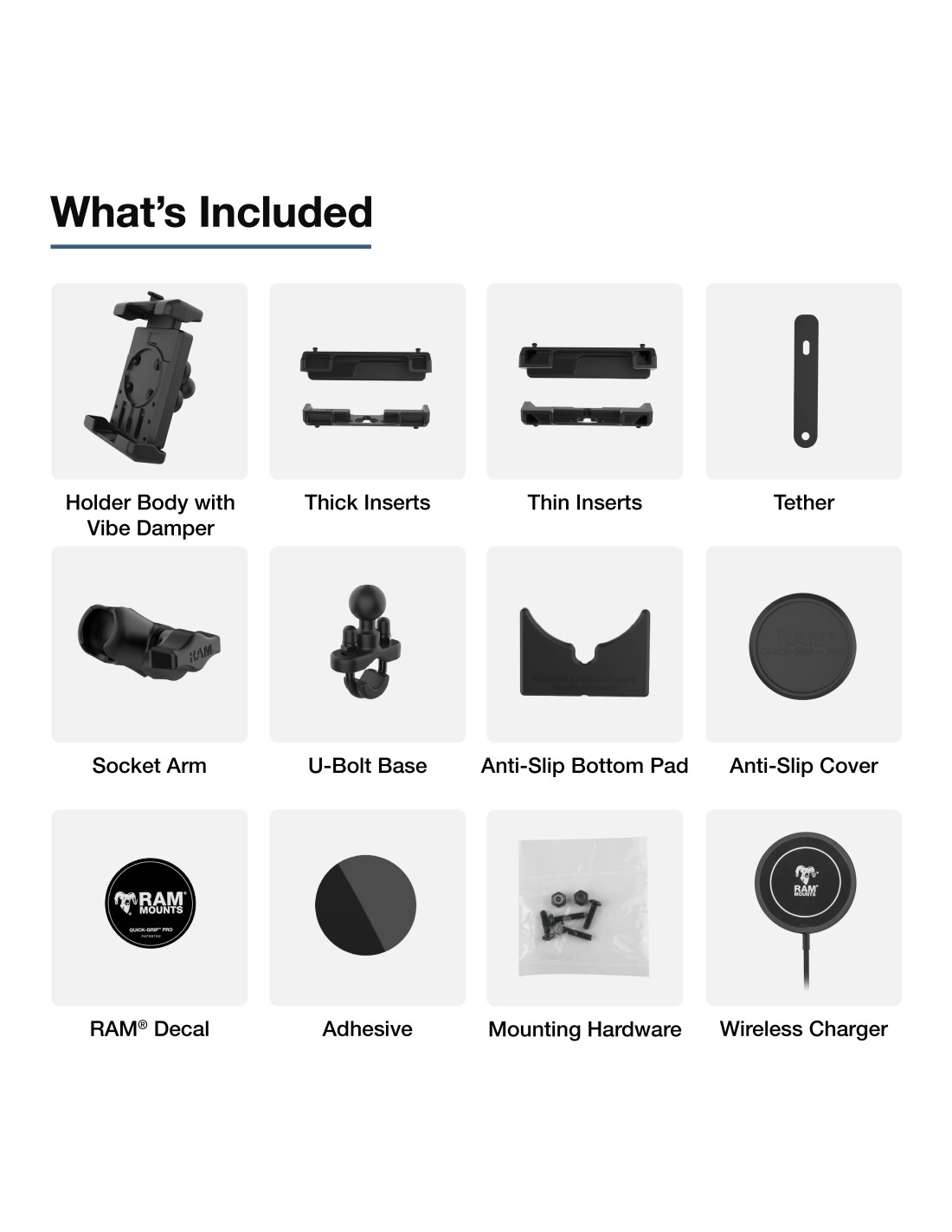 The RAM Quick-Grip Pro XL Vibration Damping Phone Mount & Qi2 15W Charger (RAM-B-149Z-A-PD7V-W2MU) is an ideal handlebar solution featuring the next evolution of the RAM Quick-Grip series, re-designed to be the most rugged universal phone holder that fits a wide range of phones and handheld devices. This phone holder comes with the RAM Qi2 wireless charger and features an integrated cavity to secure it in place. This phone holder comes with an anti-slip cover ensuring a flush fit when the wireless charging puck is not installed. The RAM Quick-Grip Pro XL features a spring-loaded design that allows easy one-handed insertion and removal of your device. Large and small shims are included to provide a snug, secure fit for large and small phones without a case. This kit includes a zinc-coated handlebar U-Bolt base that accommodates rails from .5 to 1.25 in diameter. RAM recommends installing the provided device tether when this holder is used in a vehicle with an open cockpit. It is important to verify the dimensions of your handheld device with its case, sleeve, or skin when determining the overall size.