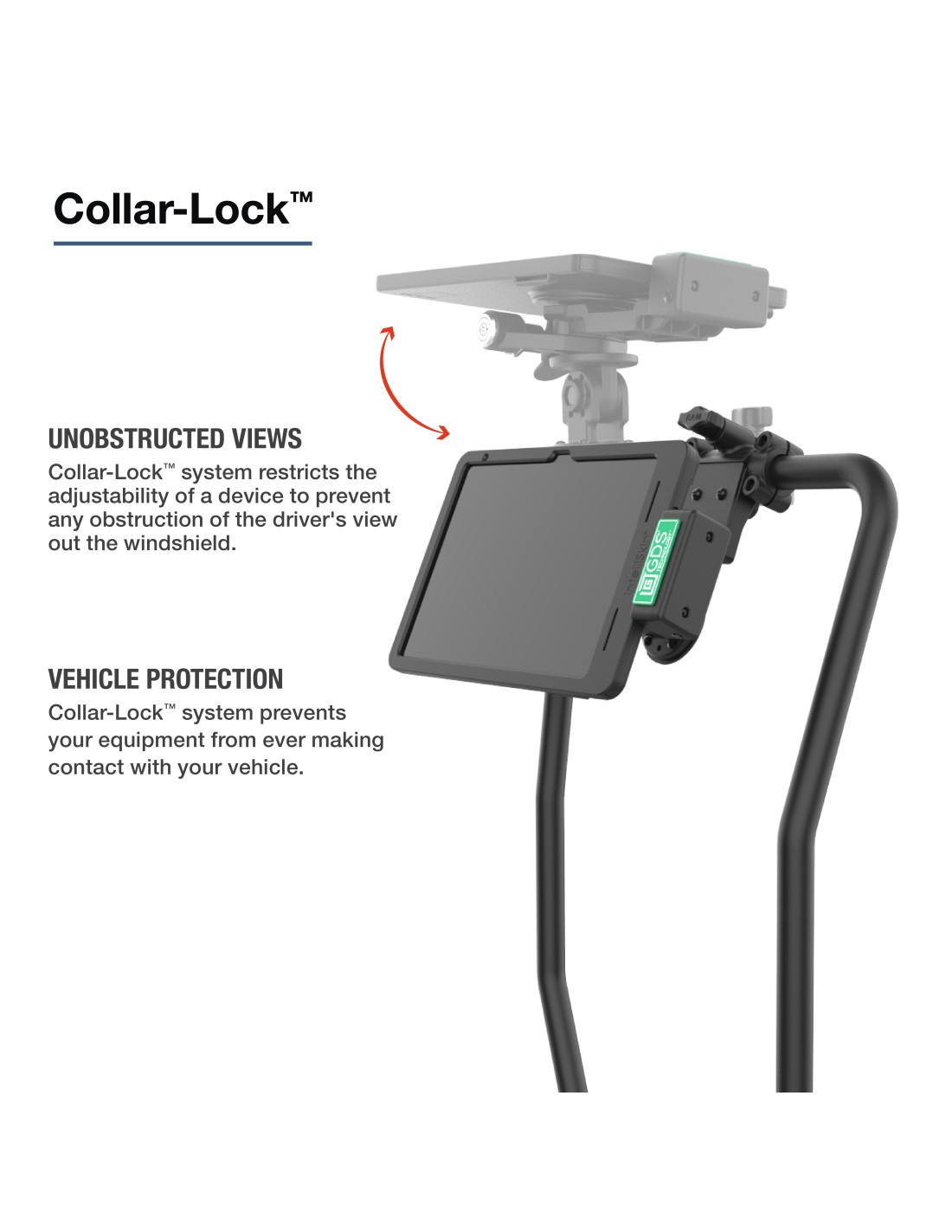 - Integrated Collar-LockT system prevents over-rotation to protect devices and vehicle interiors during adjustment or impact
