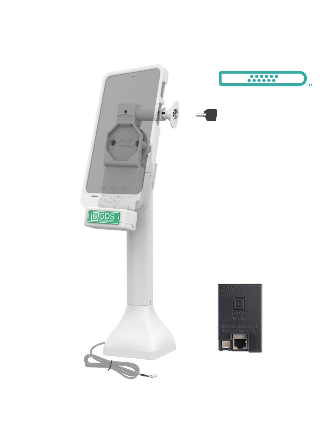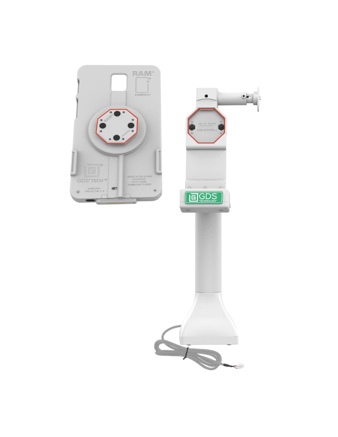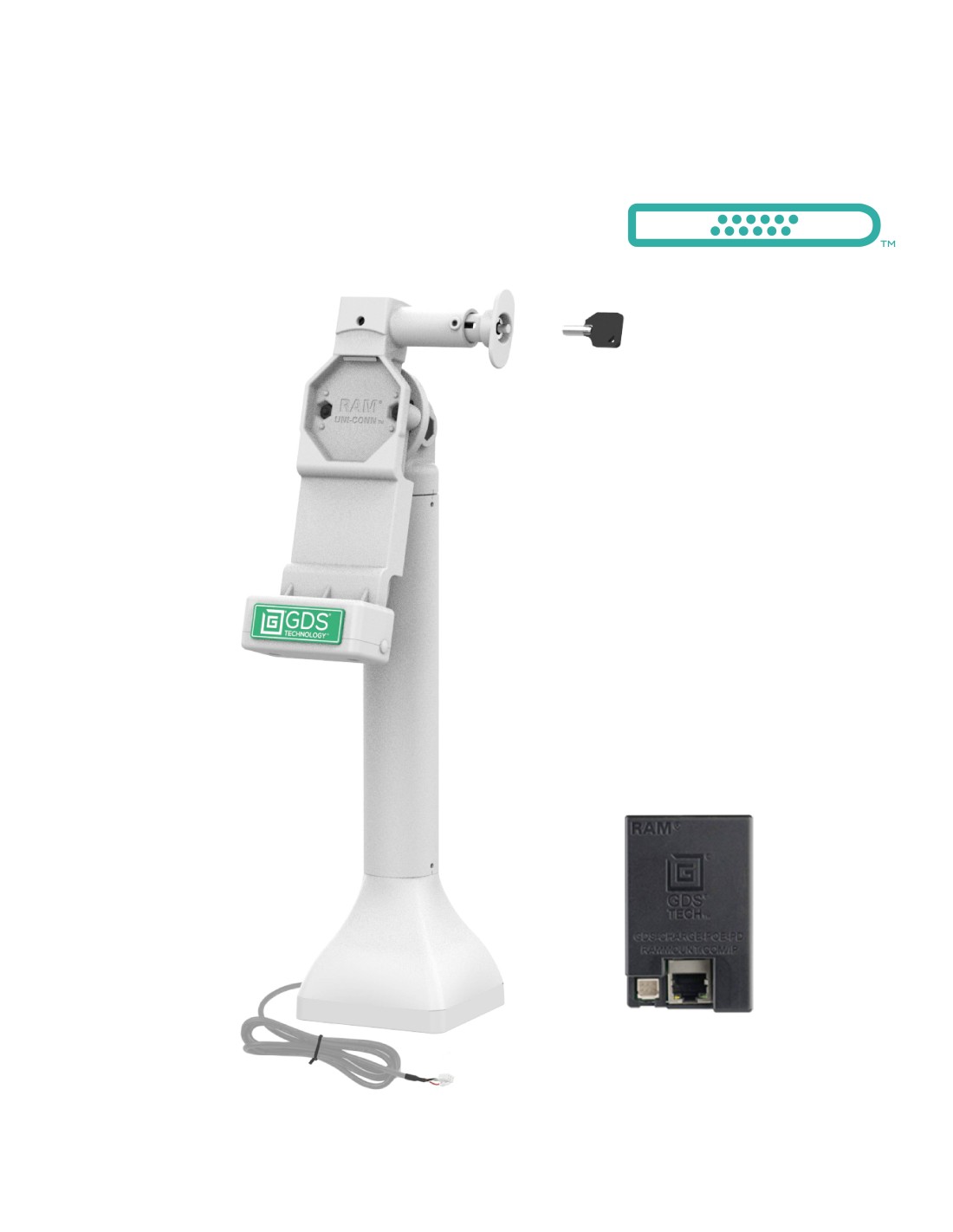The GDS Uni-Conn 14" Locking Pedestal Dock with PoE - Gray (RAM-GDS-DOCKL-D11-14-U4E-GRY) is a free-standing, 14" pedestal dock for devices enclosed in an IntelliSkin Next Gen, IntelliSkin Hard Case, or standard IntelliSkin Thin-Case with a GDS Uni-Conn adapter. This solution can swivel 180 degrees and allows devices to tilt 180 degrees, which is ideal for customer-centric industries like retail, hospitality, food service, and more. Keep your device safe in high-traffic environments with the key lock, integrated to provide additional theft deterrence. Power is provided to the pogo pins integrated into the GDS Uni-Conn dock via Power over Ethernet (PoE) connection. This dock features a drill-down attachment style, providing a stable base for the tall dock. The light gray aesthetic is ideal for sophisticated, bright workplaces. One Dock to Connect Them All Always Protected. Always Connected.