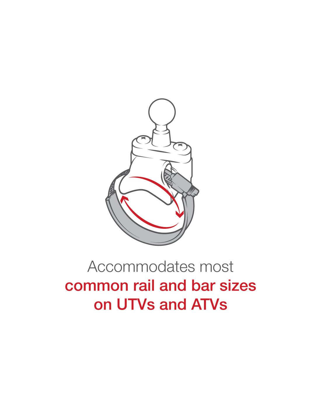 The RAM-B-149Z-2-202AU consists of a steel strap base, u-bolt bases, double socket arm and 2.5" dia. round base with 1/4"-20 threaded post. Designed for a clean installation, the included roll bar base accommodates most common tubing sizes on UTVs and ATV's, allowing for the placement of the RAM rubber ball base. Safely concealing a strap clamp in a compact housing, you won't have to worry about exposed sharp edges or unwanted loosening. The camera base contains a 1" rubber ball that is connected to a 2.5" diameter round base. Also, included is a 1/4"-20 threaded steel stud, centered, the round base provides support and stability for cameras that rest on top of it. The male 1/4"-20 threaded steel stud will connect to any standard female thread found on camcorders and digital cameras.