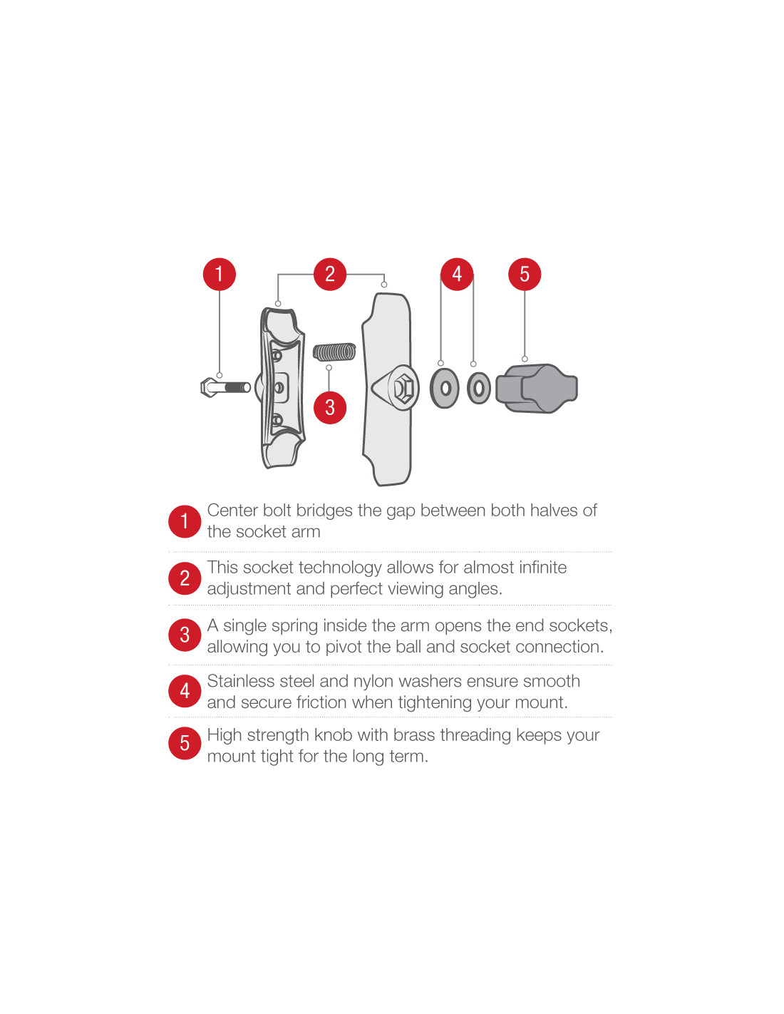 The RAM-B-149Z-C1U consists of a zinc coated u-bolt base, standard size double socket arm and universal 1/4"-20 thread, centered on a 2.5" diameter plate. The male 1/4" long, 1/4"-20 thread in the middle of the 2.5" diameter plate will connect to the standard female thread found at the bottom of most still and video cameras. Included in this package is hardware that will accommodate rails from 0.50" to 1.25" in diameter. The base includes black cover caps to be placed over the exposed ends of the u-bolt. The included composite rail adapter can narrow the rail to a minimum width of 0.5". The mount is designed with a RAM 1" diameter patented rubber ball and socket system that has adjustment points at both ends of the double socket arm; this allowing for almost infinite adjustment and perfect viewing angles.